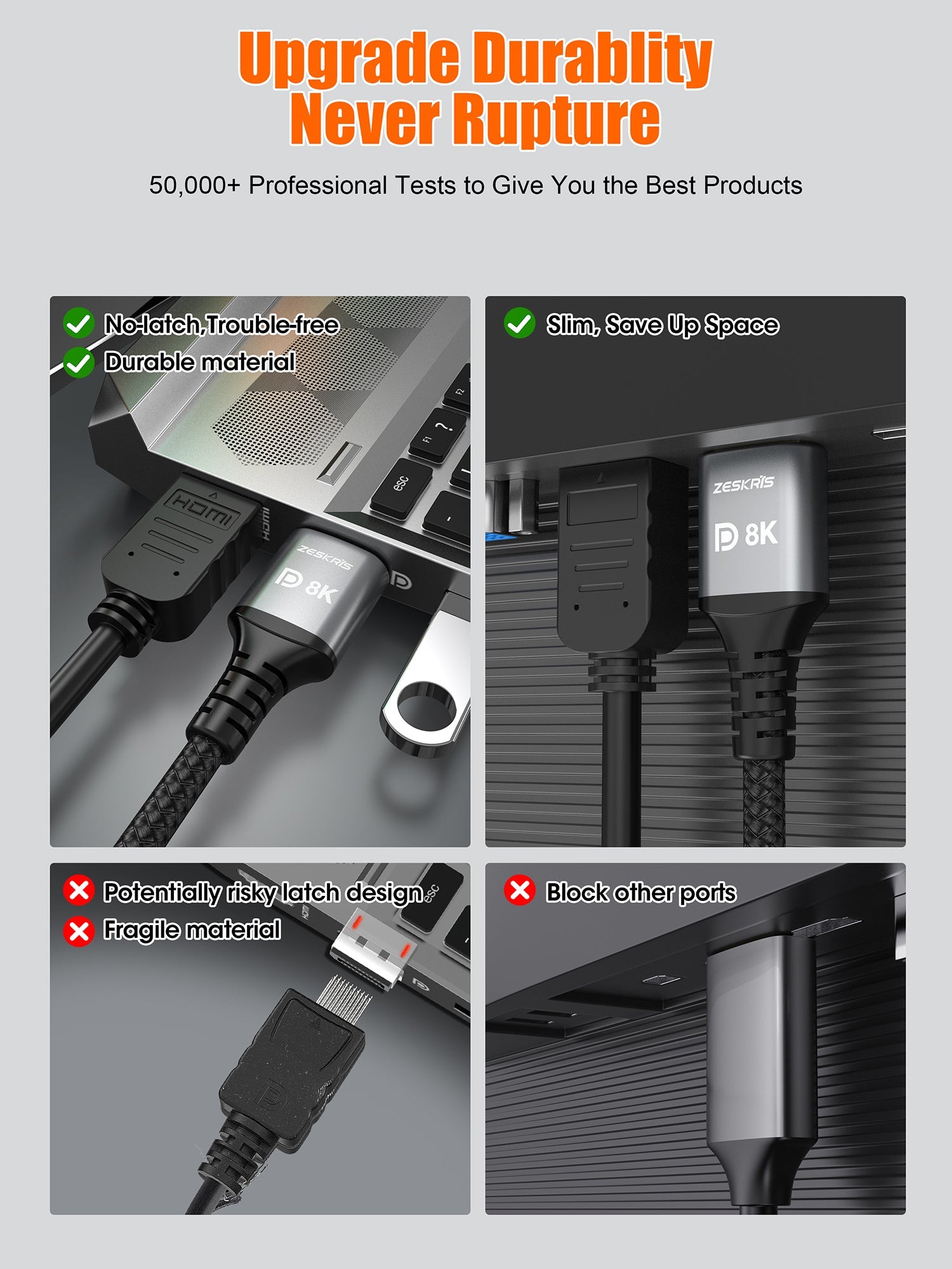 - [Future-Proof Your Setup] With 32.4Gbps bandwidth, 8K (7680x4320@60Hz), 5K (5120x2880@60Hz), 4K (3840x2160@144Hz), 2K@240Hz, 1080P, HBR3, DSC2, HDR10, 30 bit RGB color and HDCP 2.2 2.3, Forward Error Correction, 1536kHz audio sampling rate, ZESKRIS Display port cable is fully compatible with the latest devices, Large FPS-game and ultra HD video streaming