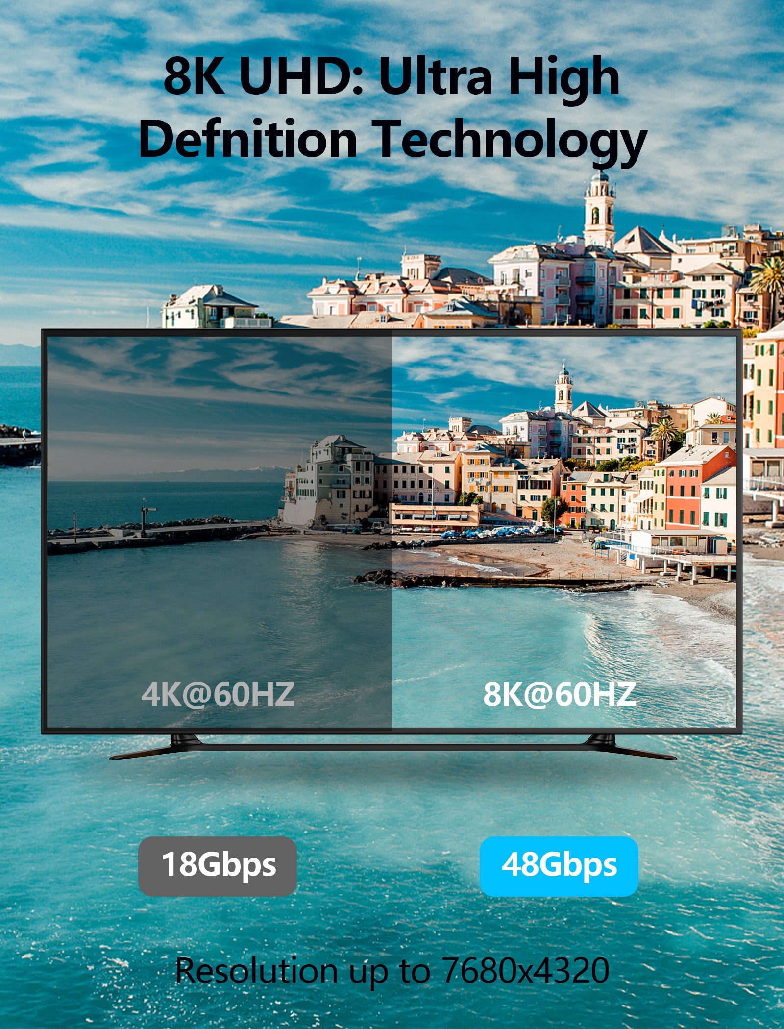- [True 8K HDMI Cable] ZESKRIS Ture 8K HDMI cable uses the most cutting-edge technology. Our 100% genuine 8K HDMI cable support 48Gbps bandwidth, it can achieve a resolution of 7680x4320 and supports high-frequency 8K@60Hz, 4K@120Hz, 144Hz, 8K unique, and upgraded Dynamic HDR, eARC, HDCP 2.2 2.3